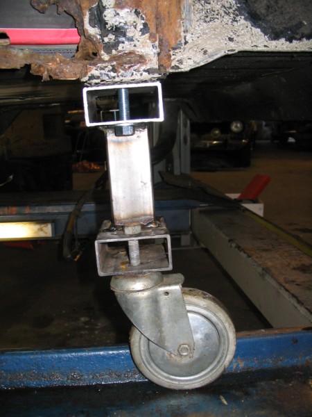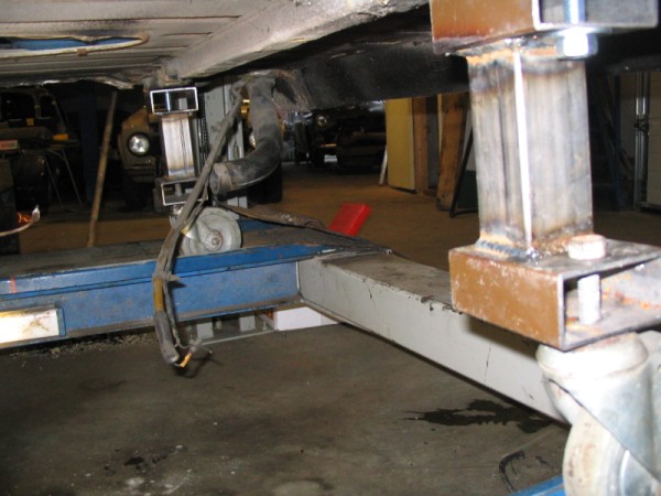 Verder heb ik nog een constructie onder de auto geknutseld, nu kan ik de auto zonder problemen op een vierkoloms brug krijgen. Deze constructie zit aan de achterkant, ik heb de punten waar het subframe in komt gebruikt.