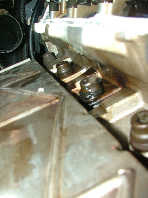Mooi plaatje van de kopbout van boven, duidelijk de kit zichtbaar. ik weet het bijna zeker, de olie lekt daar vandaan! Het “bakje” rond de bout stond helemaal vol.
