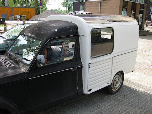 Een gewone Dyane heeft geen hutje achterop.