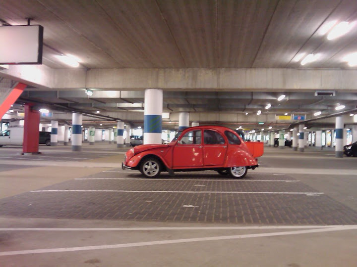 Gistermiddag op de A4 een oranje/fel groene 2cv met 2 jongens erin.