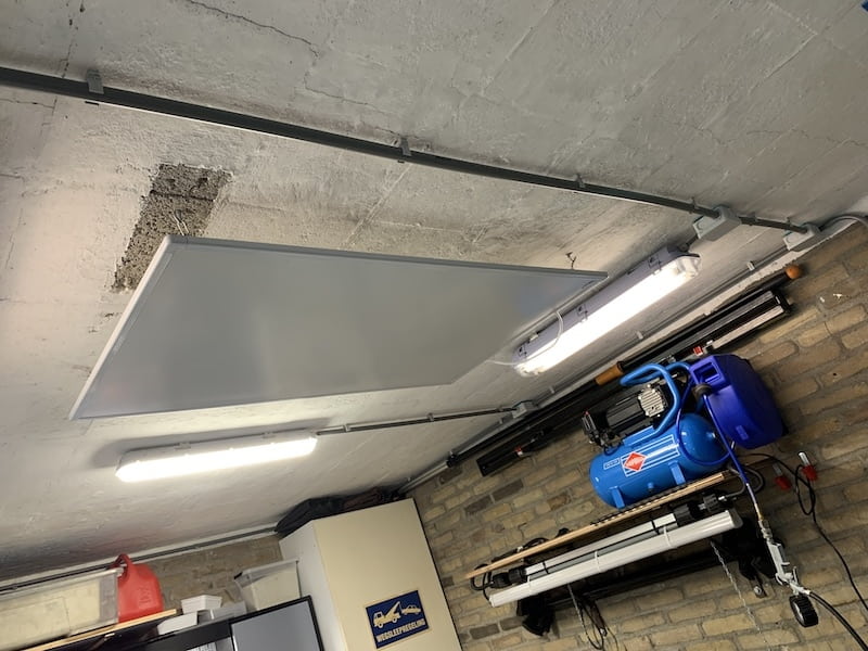Die ándere upgrade is het 1000 watt infraroodpaneel aan het plafond. Mits je er enigszins onder staat, bijvoorbeeld als je het motorblok uit een MINI aan het hijsen bent, is dat aangenamer dan onverwarmd. Leuk in theorie, maar in de praktijk moet het hele concept zich nog wel bewijzen.