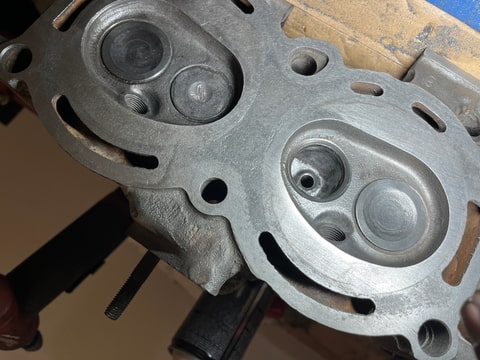 De verbrandingsruimten schoon, kleppen schoon, kanalen schoon en glad. De koppen zijn daarmee klaar voor de laatste fase, het opnieuw inslijpen van de kleppen en het vervangen van de klepseals en klepveren.