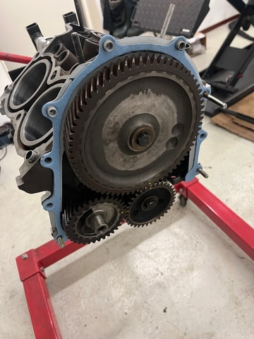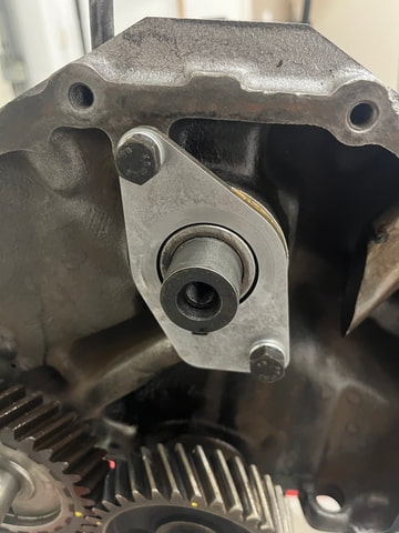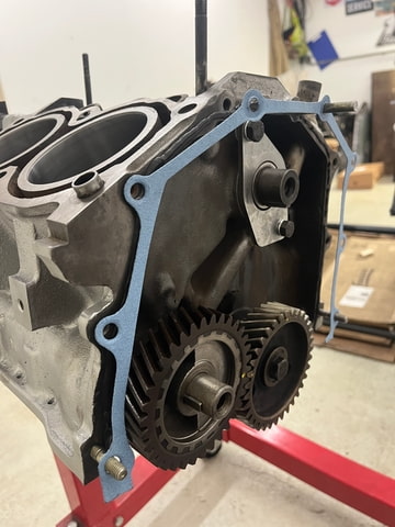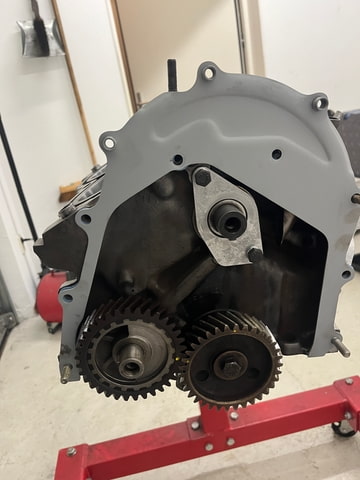 Met een nieuw lager in het distributiedeksel kon dat deksel ook gemonteerd worden. Maar eerst de nokkenas op z’n plek met een nieuwe opsluitplaat. Dan de tussenplaat er tussen met een nieuwe pakking, de distributietandwielen, het deksel met een nieuwe keering, een nieuwe pouly (de oude was ingelopen) enz enz