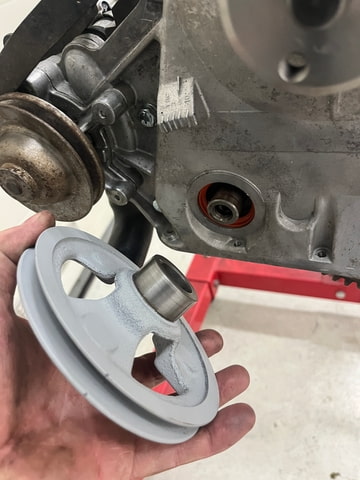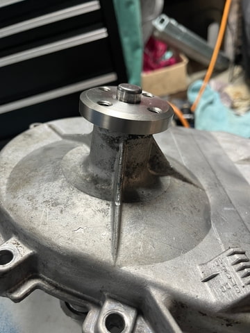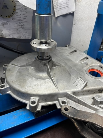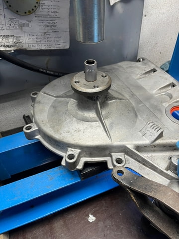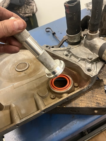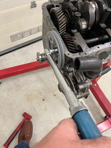 Gisteren weer verder met de motor. Om te beginnen met een nieuw koelfanlager in het distributiedeksel. De ouwe moet je er uit persen en dan weer een verse er in..