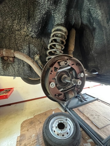 Omdat ik nu toch aan het wachten ben op die HRC was dat een mooi moment om ff door te pakken met het remsysteem. De schijven en blokken vóór heb ik gedaan, de remzuigers voor zijn goed gangbaar en daarmee is voor oké. Dan naar achter. En daar nu eens een aangename verrassing: de achterremmen zijn al gereviseerd. Nieuwe voeringen, nieuwe cilinders. Alle remslangen die de auto heeft zijn ook al vernieuwd trouwens.
