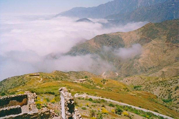 Ik wil het niet, maar de lucht is bedekt met wolken: niks aan. We breken op en gaan linksaf in de richting van het vliegveld. We volgen ruim 90 km de N10 in de richting van de stad Taroudant. Vanaf de kust tot hier alleen maar fruitbomen: dit land is helemaal niet arm, er is werkelijk van alles te vinden. Alleen is het voor een bepaalde groep, die alles exporteert naar Europa. Je ziet een continue stroom van afgeladen vrachtwagens, die alles naar de haven slepen. Na zo’n 140 km gaat de N10 naar rechts en kom je in Ouarzazate, maar daar zijn we op de heenweg al geweest. Wij gaan rechtdoor over een andere weg naar de grote stad Marrakesh. Als even later de weg begint te klimmen, staat er een bord met de info dat we 120 km lang virages krijgen: dat lijkt me wel wat! Vrij snel na het bord begint het feest al en het zal inderdaad niet meer ophouden: de ene bocht na de andere. De weg is soms smal en dan weer stoffig. We rijden door de bewolking, maar ook het uitzicht is fantastisch. Zo’n weg heb ik nooit eerder gereden! We gaan steeds hoger en kijken op de wolken neer alsof we in het vliegtuig zitten.