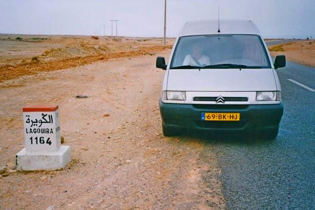 Het is geheel bewolkt en er staat een stevige wind. We rijden nog een stukje naar het zuiden en zoeken een kilometerpaal die de afstand naar het uiterste zuiden toont: dat is een plek die een enorme aantrekkingskracht op me uitoefent. De stad in het uiterste zuiden is Nouâdhibou met ernaast La Gouira. Ik vind een paal: tot de grens met Mauretanië nog 1.164 km. Vroeger ging je hier in konvooi en onder begeleiding over de piste verder naar het zuiden. Ik hoorde van een Belgische jongeman dat hij acht maanden geleden over de heenweg nog drie dagen deed. Sindsdien is er reeds 500 km asfalt neergelegd en zo heeft hij datzelfde stuk terug in één dag gereden. Zo komt Dakar steeds dichterbij.